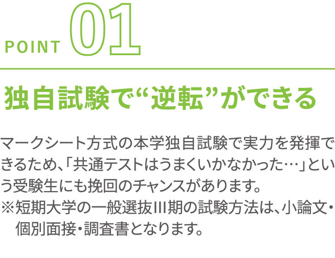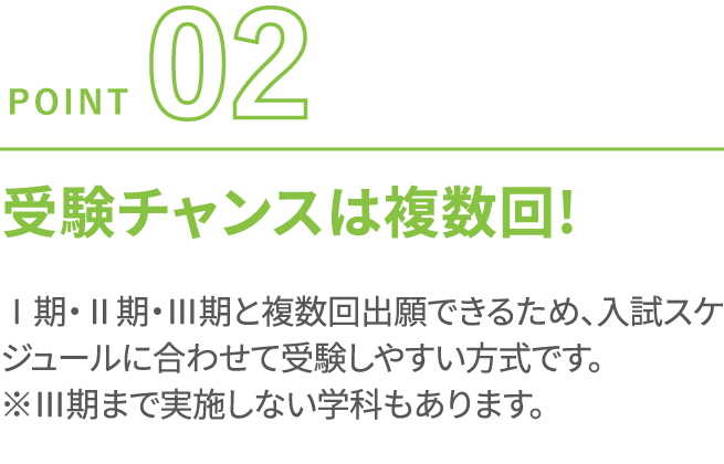 得意分野を最大限に活かし、合格をしっかりと狙える受験方式を選べます。同時出願で受験すれば、可能性はさらにUP!チャンスを広げて、自信を持って挑戦できます。