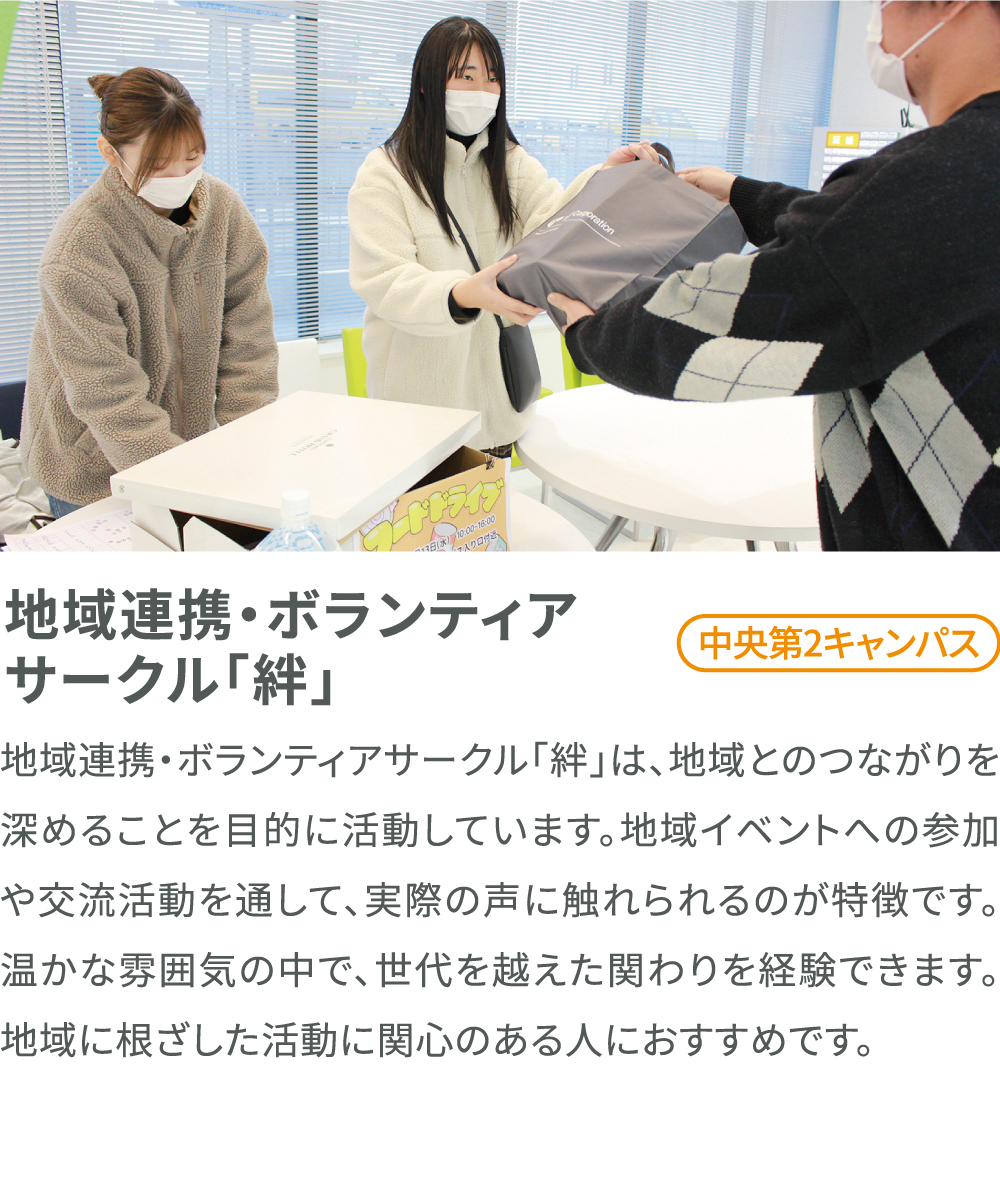 - 各サークルに興味関心のある方は、学生総合支援センターの掲示板にあるポスターまたはUNIPA(学内ポータルサイト)の掲示板を確認し、各サークルの問い合わせ先へ直接連絡してください。