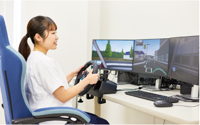 運転が困難な患者が運転に復帰するための検査や練習を行う模擬運転装置です。難易度や昼夜設定をすることでさまざまな状況の評価が可能です。