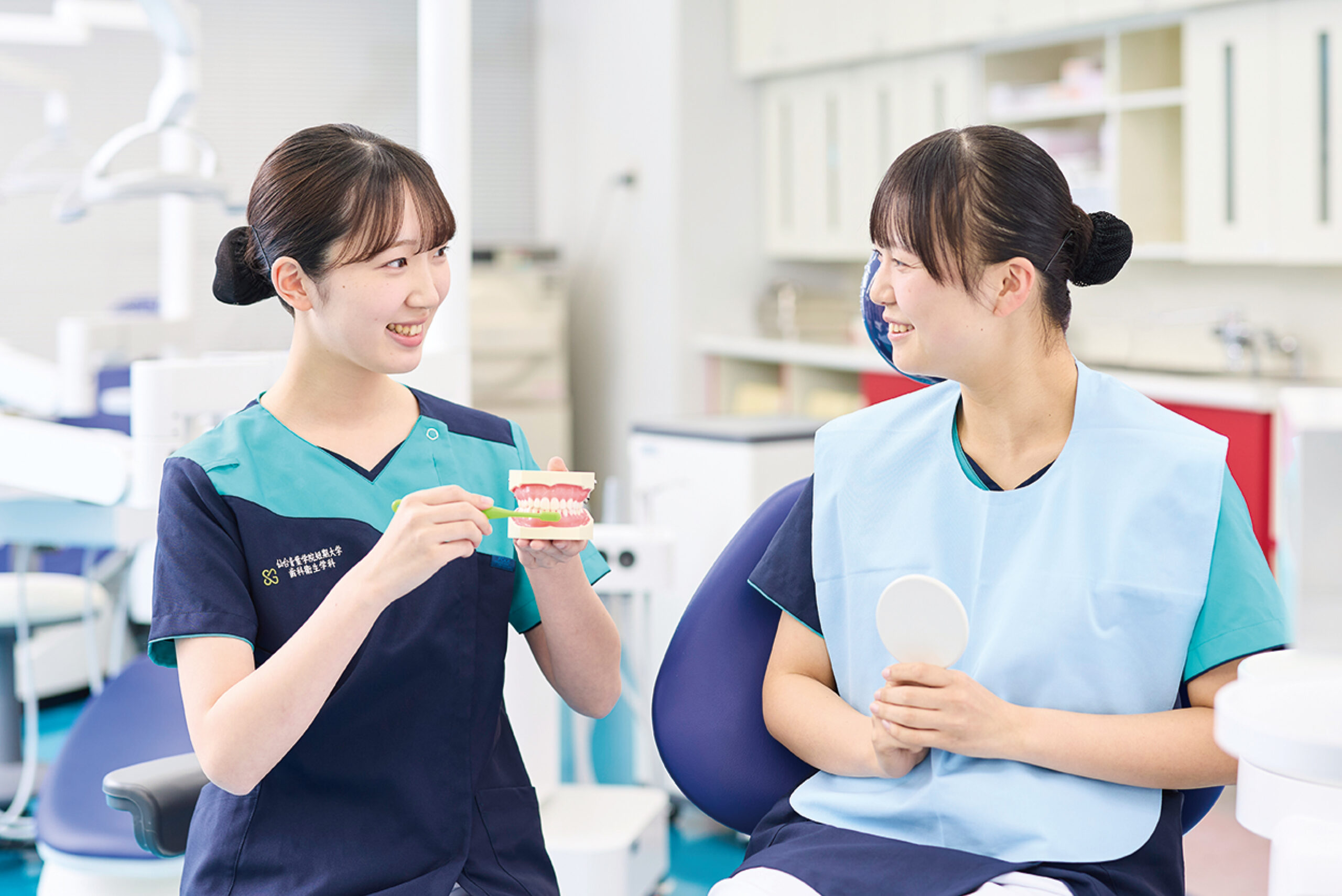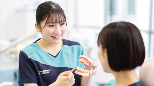 「もともと医療の仕事に何となく興味がありましたが、オープンキャンパスで歯科衛生士の仕事のやりがいを知り、進学を決めました。実習は大変ですが、患者さんの笑顔に触れるとやりがいを感じます」