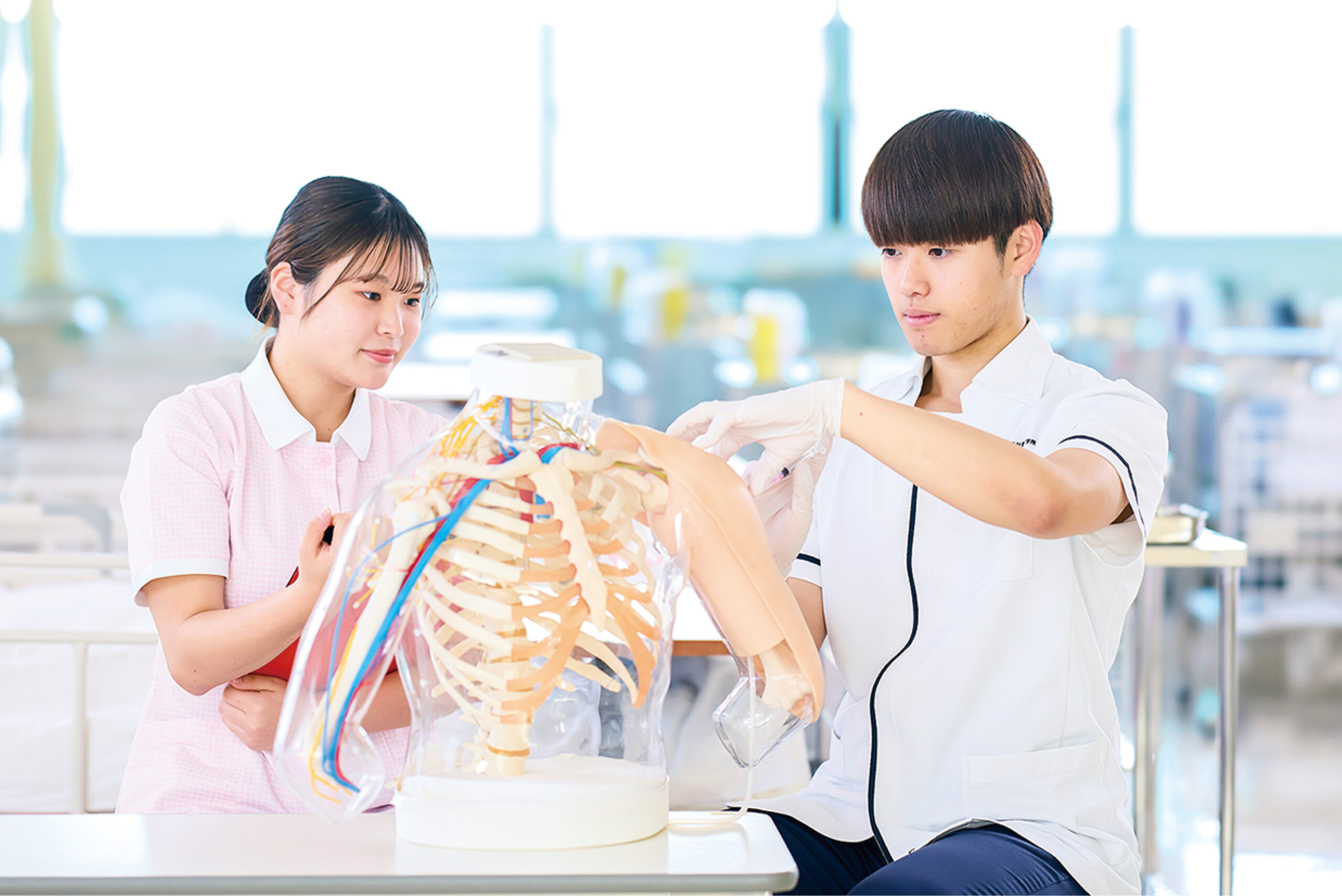 学校では人体の構造や疾病の知識、看護技術などを学びます。さらに病院や施設での実習を通して、実際の医療現場で必要な実践力を身につけていきます。