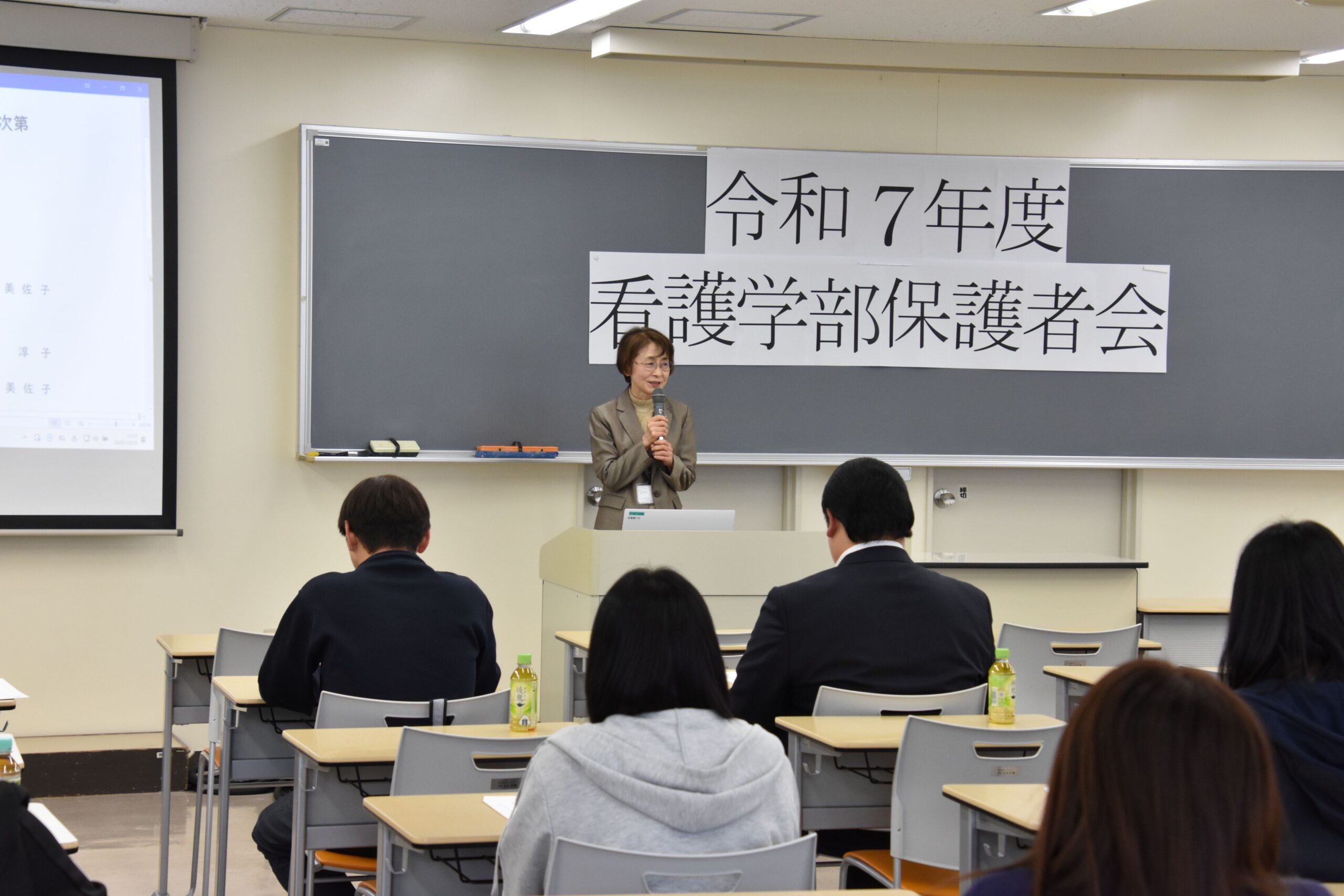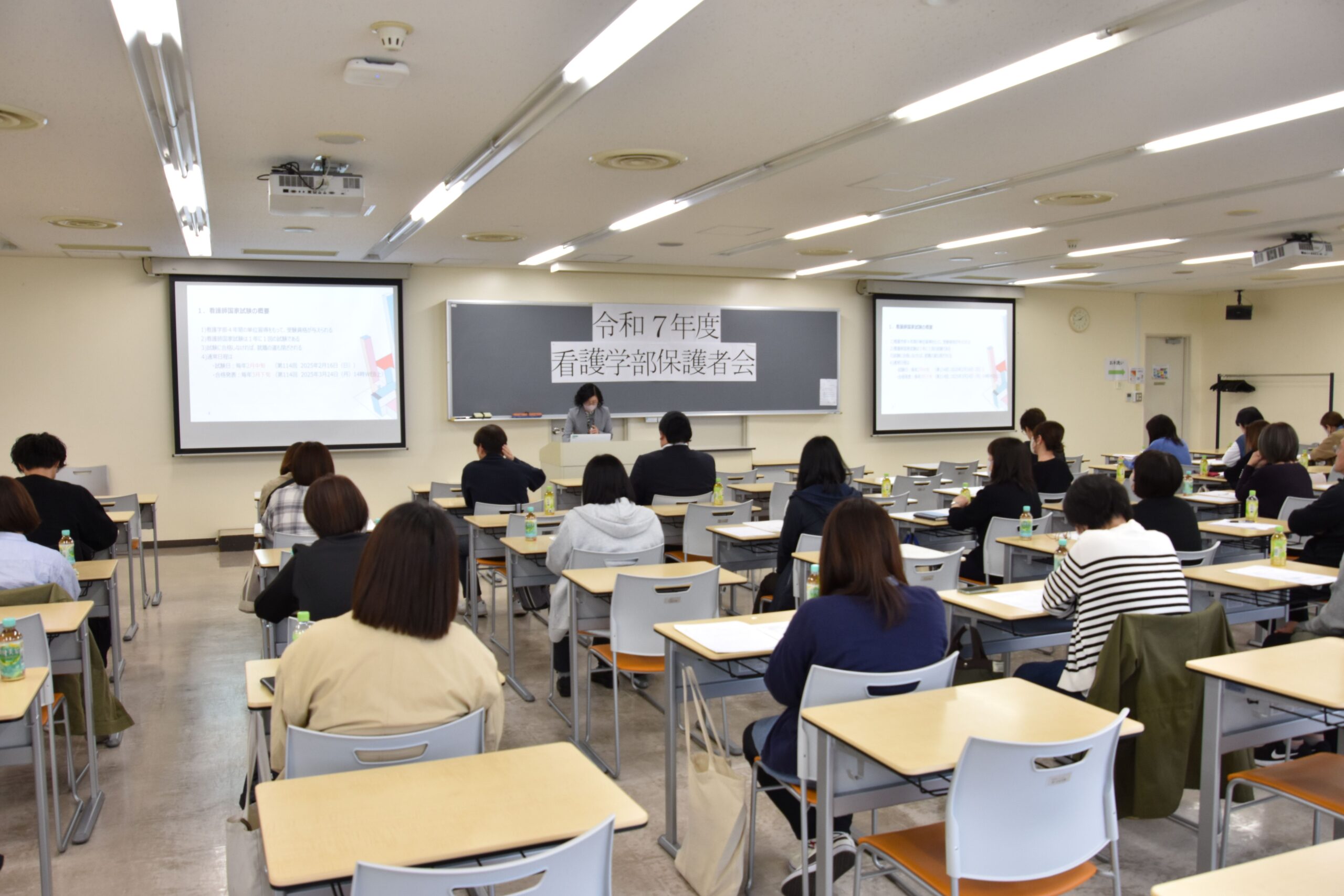 また、保健師課程については履修条件やカリキュラムの概要を担当教員より説明しました。保護者の関心は非常に高く、説明中は多くの方が熱心に耳を傾ける姿が見られました。