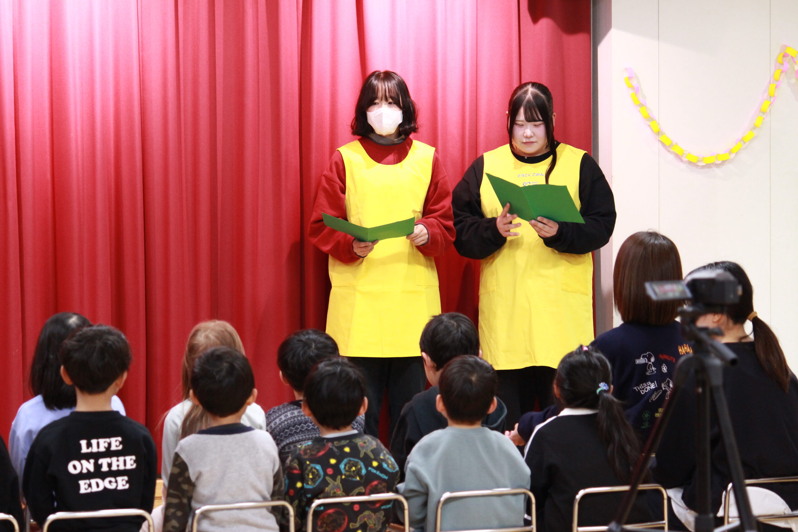 終演後には、子どもたちから歌のプレゼントが贈られました。元気いっぱいの歌声や笑顔に触れ、学生たちは保育の楽しさややりがいを改めて実感しました。