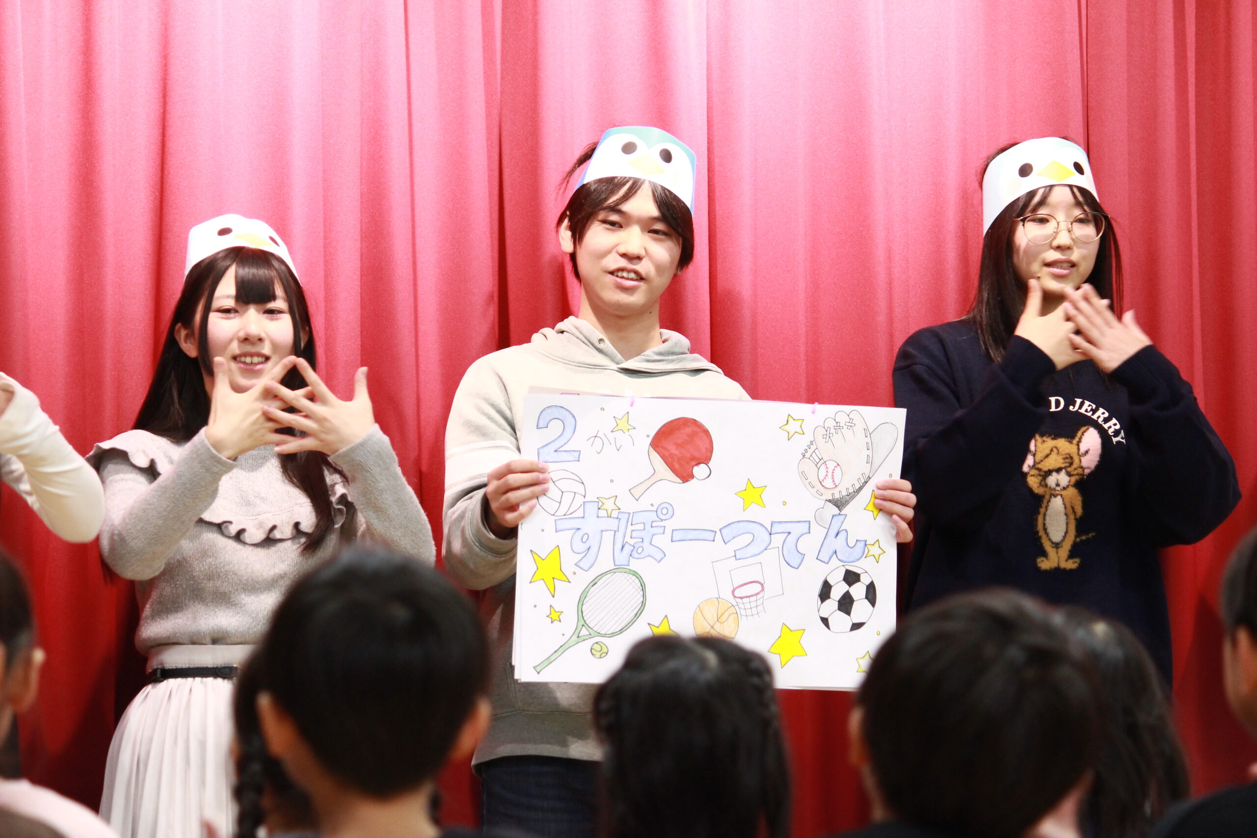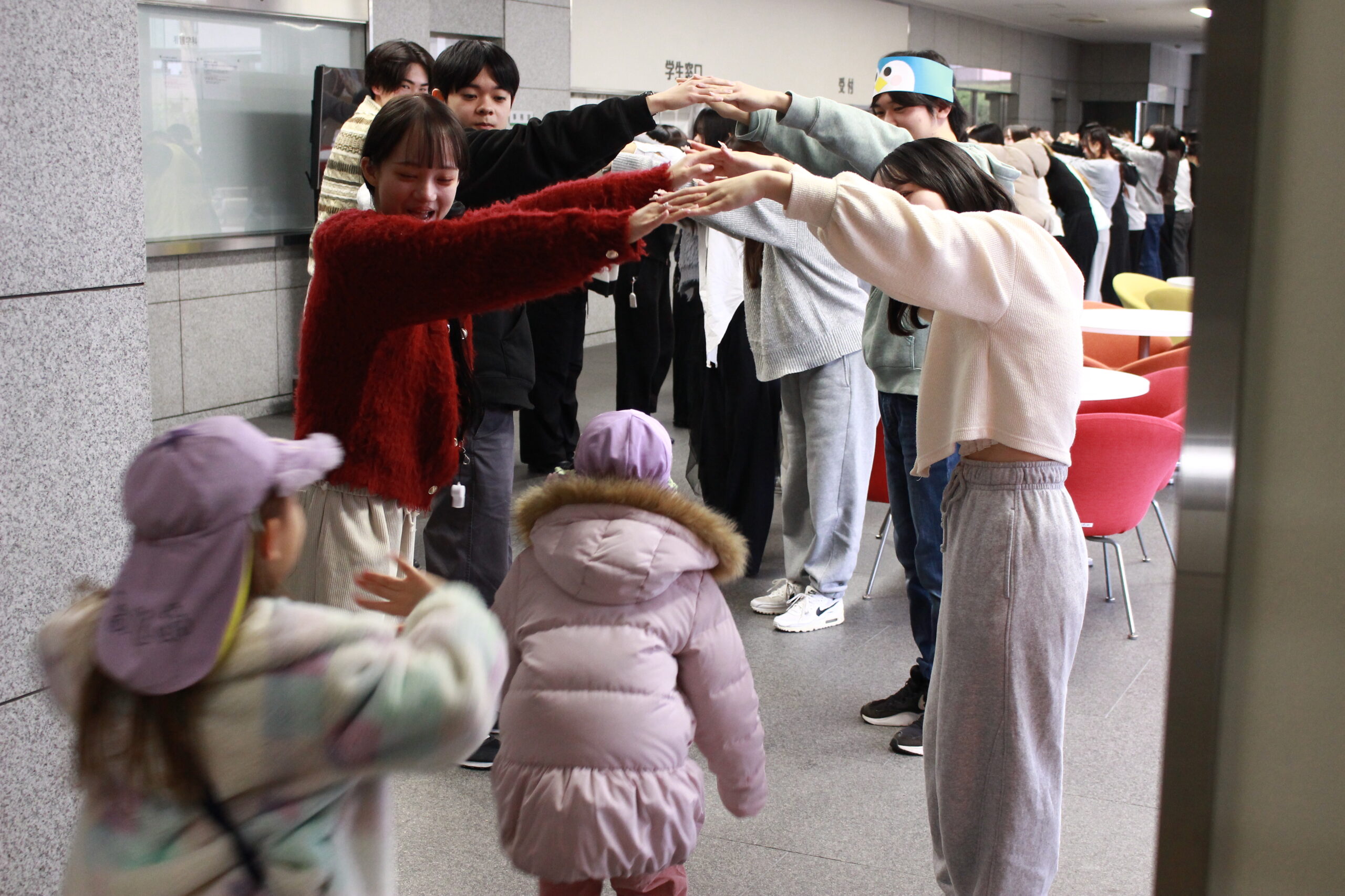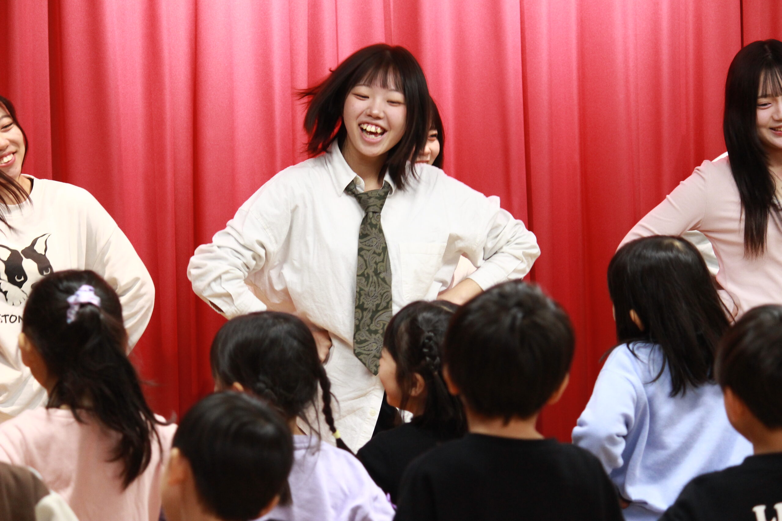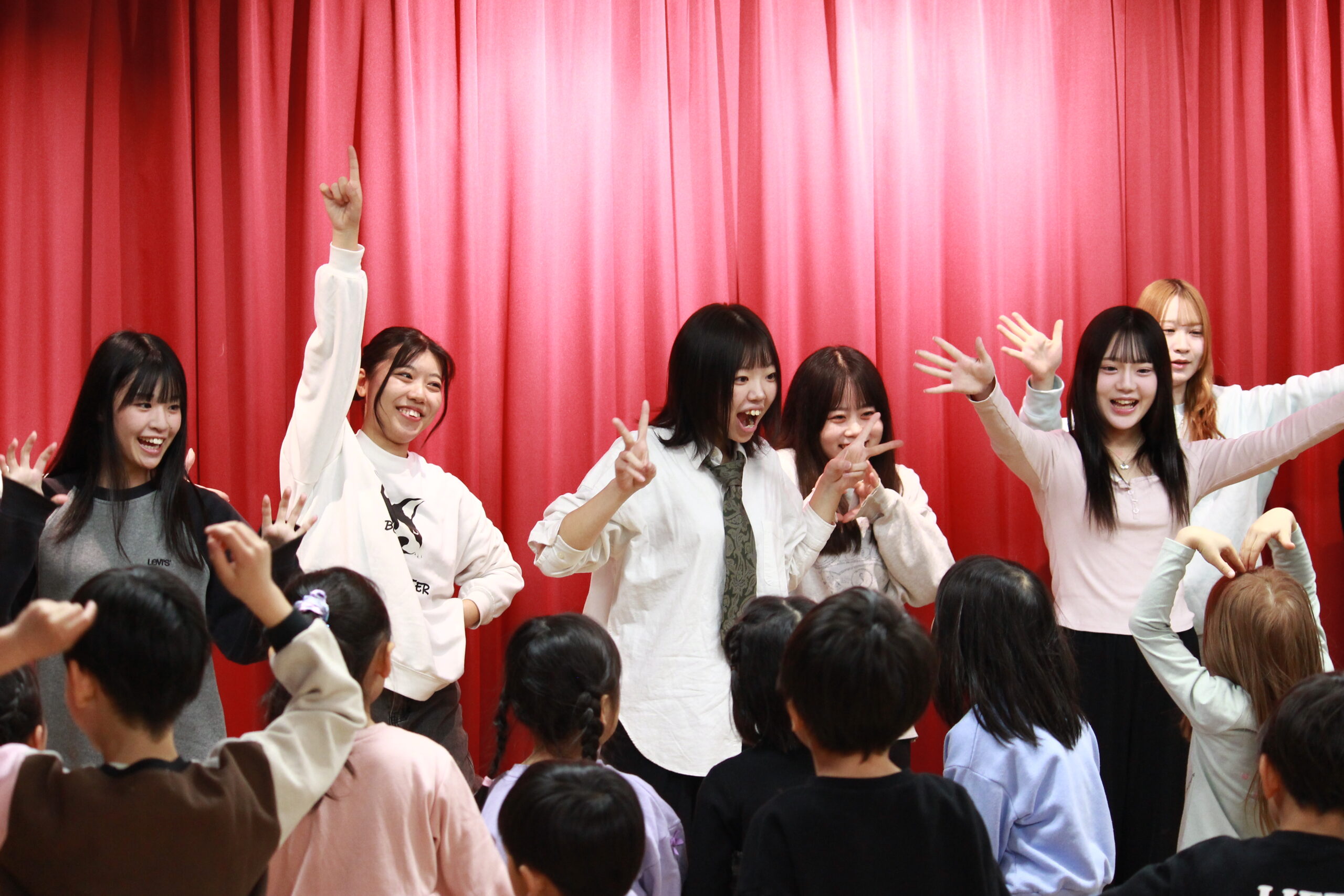 当日はオペレッタに加え、手遊びや体操、歌も披露しました。子どもたちと一緒に体を動かしたり、声を合わせて歌ったりする場面もあり、会場は子どもたちと学生が同じ時間を楽しむ、笑顔あふれるひとときとなりました。