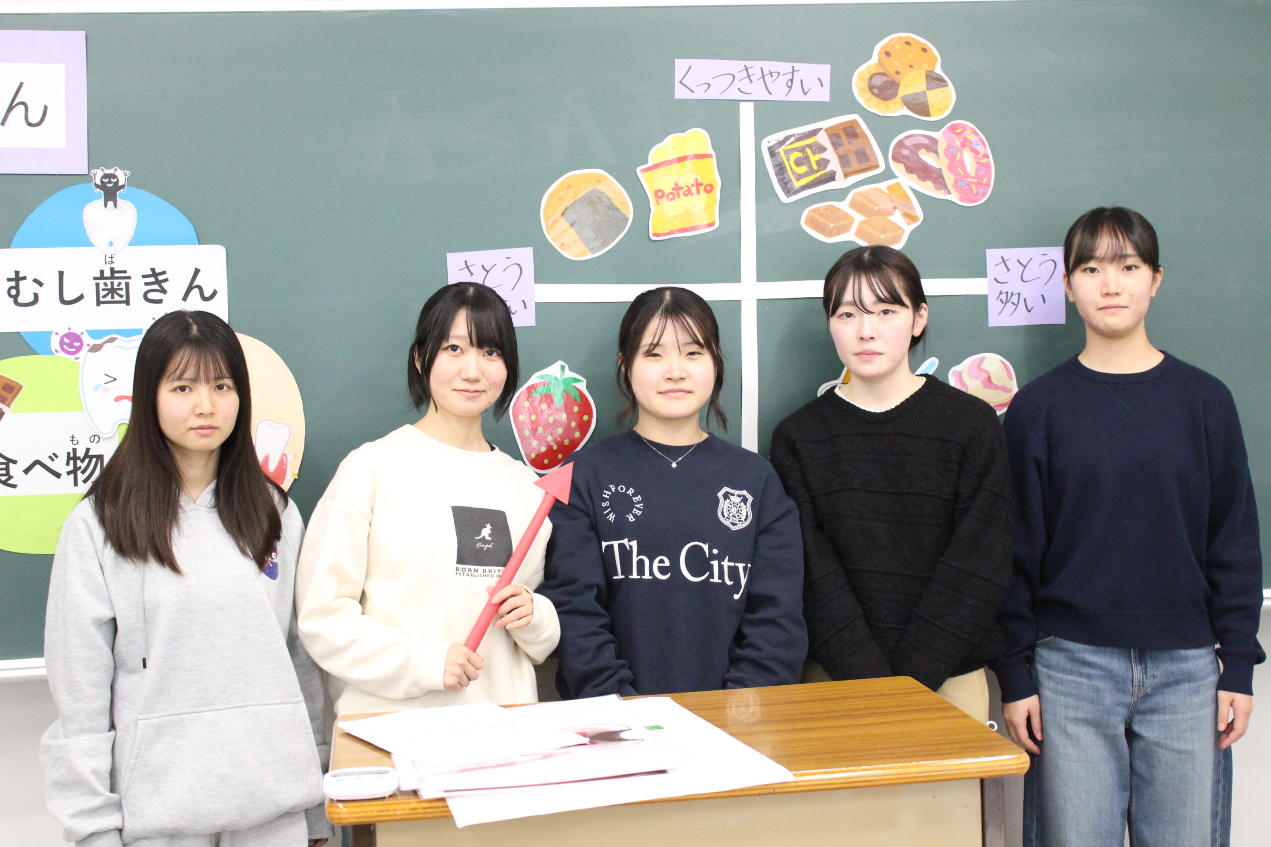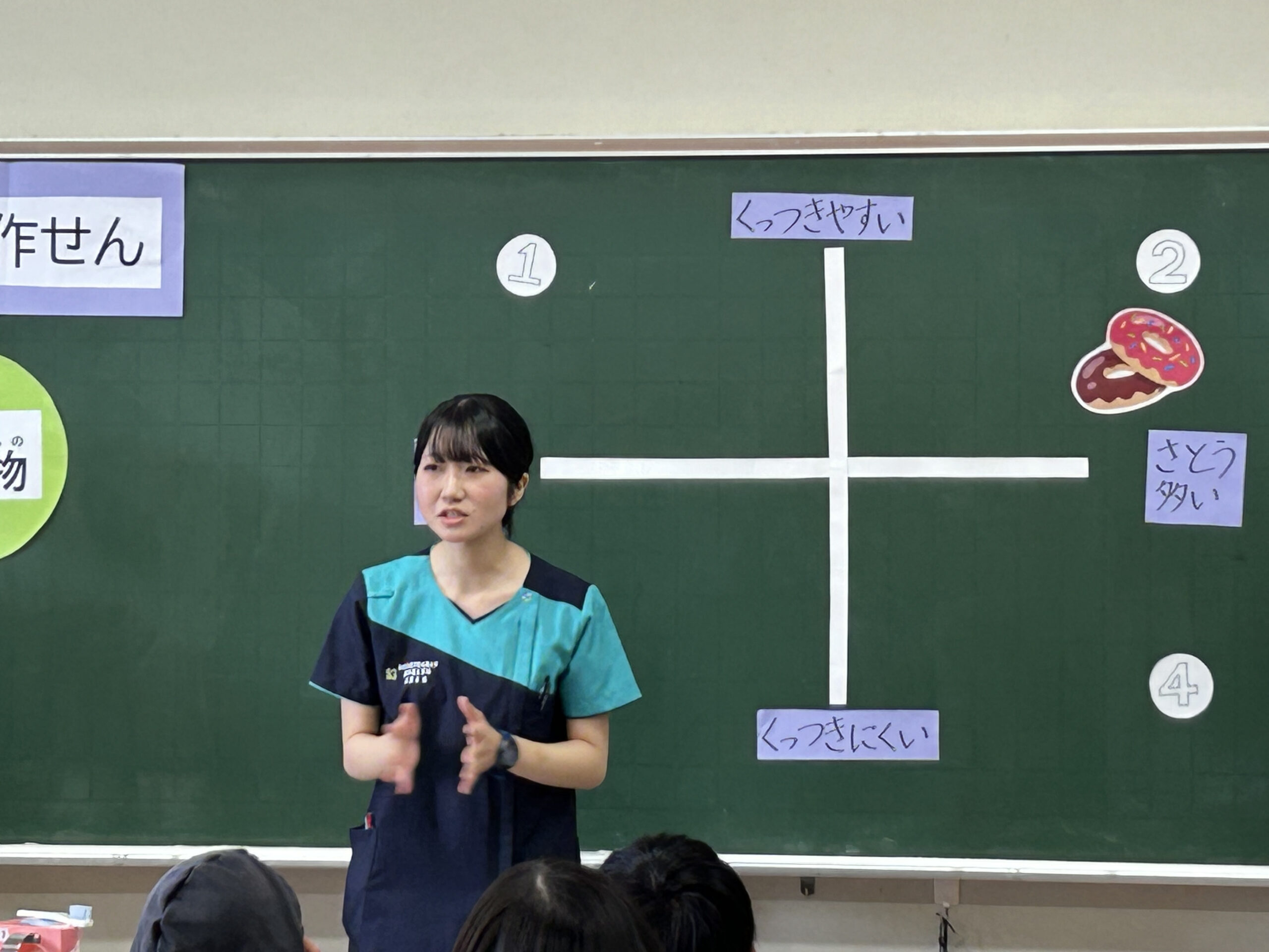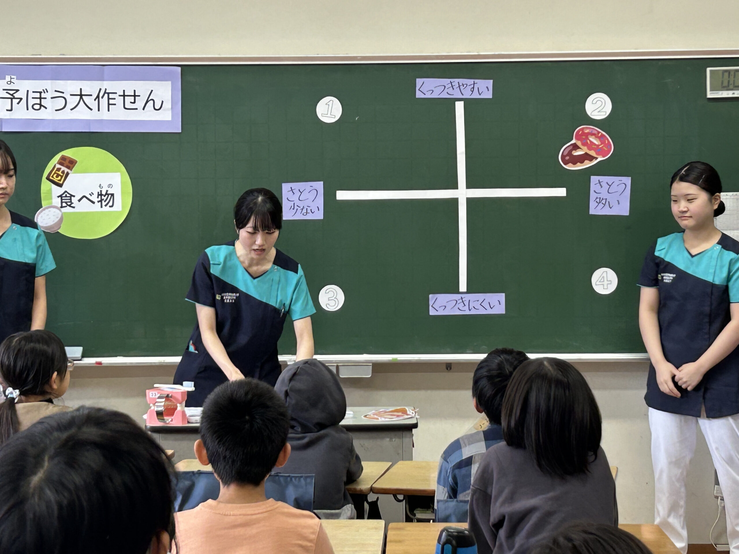 今回の小学校実習では、グループに分かれて準備を行い、保健指導に取り組みました。私たちのグループは、小学校3年生を対象に、歯を元気に保つために大切なことを分かりやすく伝える内容を担当しました。指導では、「歯をきれいにみがくこと」「食べ方に気をつけること」「毎日の生活の中で歯を大切にすること」の3つがそろうことが、口の健康につながるという考え方をもとに、イラストや模型を使って説明しました。