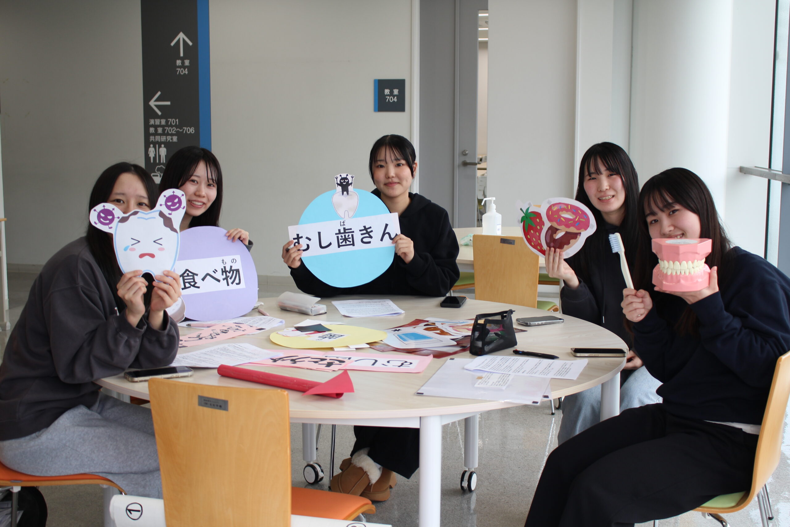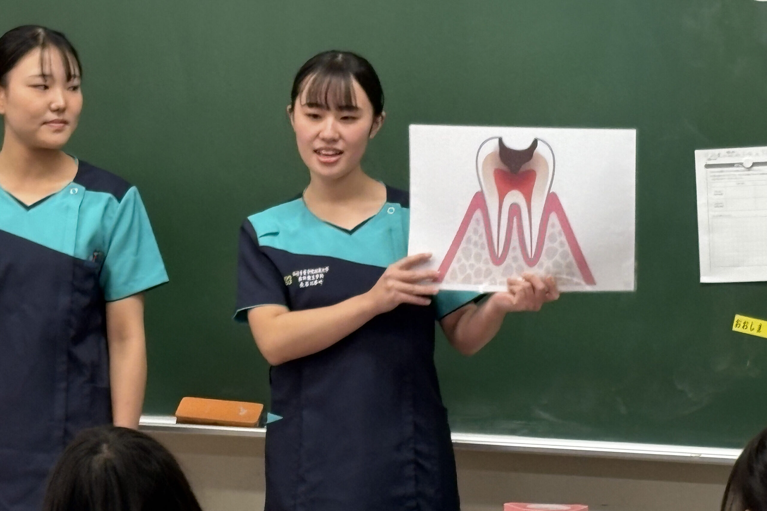 小学校実習では、3年次の先輩方と一緒にグループを組み、小学校3年生に向けて保健指導を行いました。小学生が親しみやすい「おやつ」を題材に、むし歯になりやすいものと、そうでないものをクイズ形式で考えてもらいながら、むし歯を防ぐための歯みがきについても工夫して伝えました。