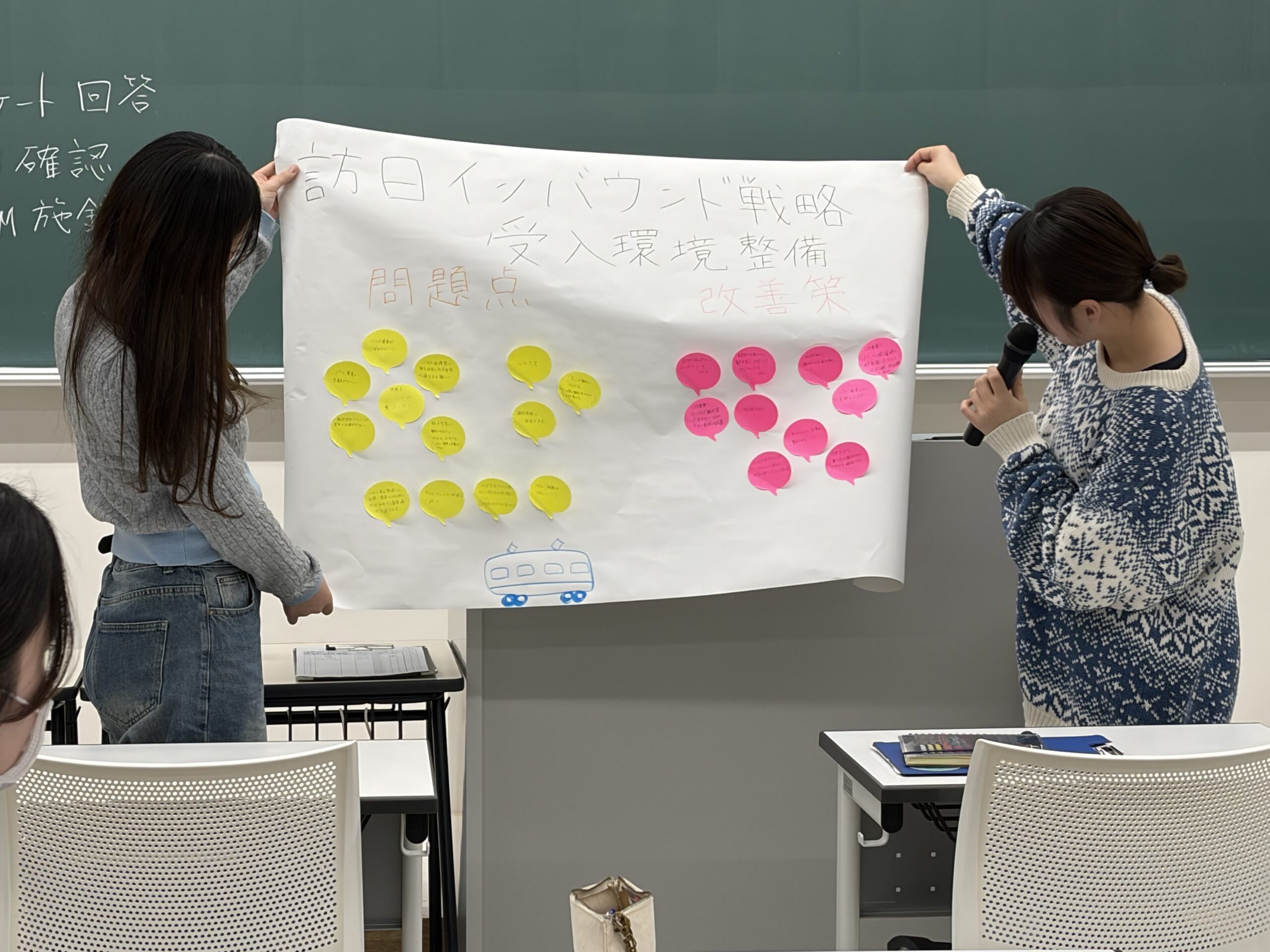 観光客を増やすためのアイデアを出し合い、国内旅行者向けと海外からの旅行者向けに分けて戦略を検討しました。