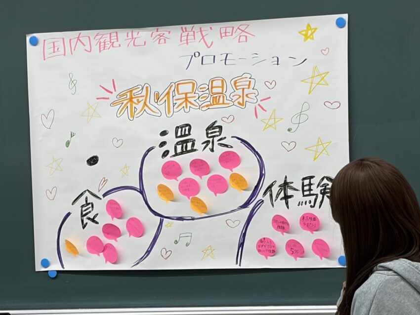 観光客を増やすためのアイデアを出し合い、国内旅行者向けと海外からの旅行者向けに分けて戦略を検討しました。