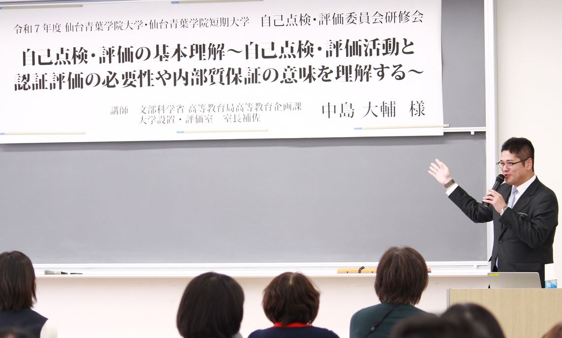 当日は、文部科学省 高等教育局 高等教育企画課 大学設置・評価室 室長補佐の中島大輔様を講師にお招きし、教育の質の向上を目指し、自己点検・評価への理解を深めることを目的として、「自己点検・評価の基本理解―自己点検・評価活動と認証評価の必要性や内部質保証の意味を理解する―」をテーマにご講演いただきました。