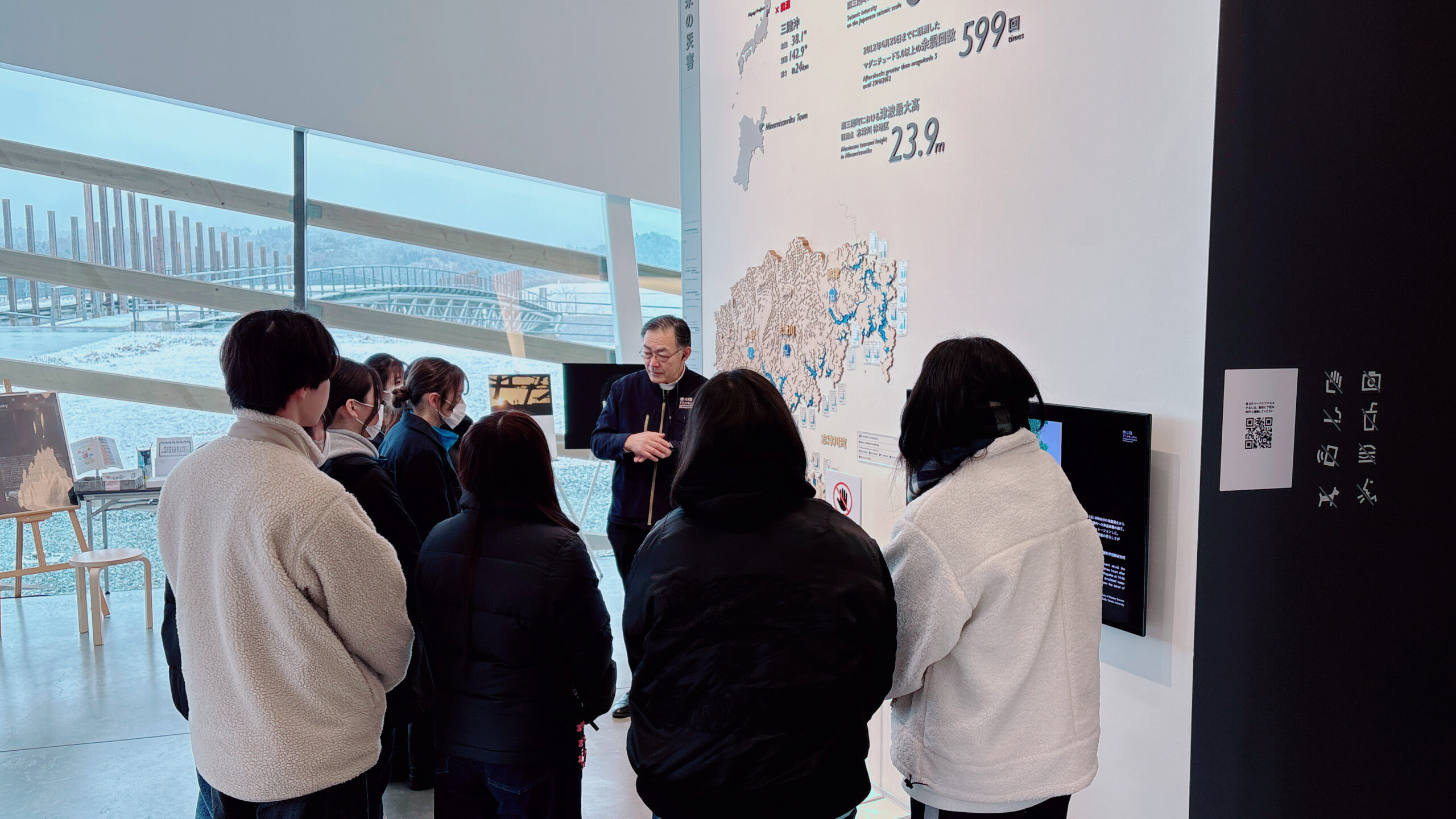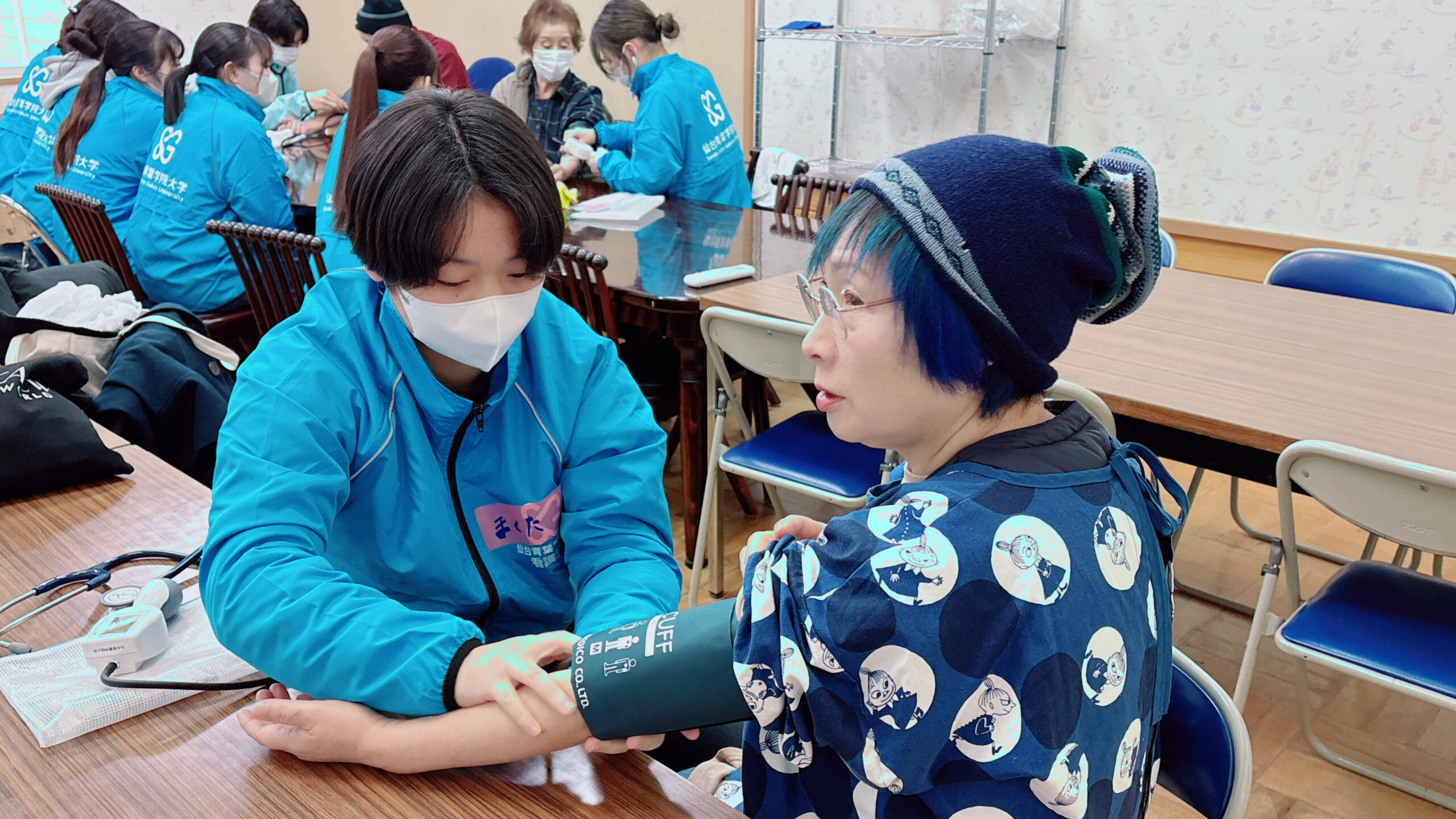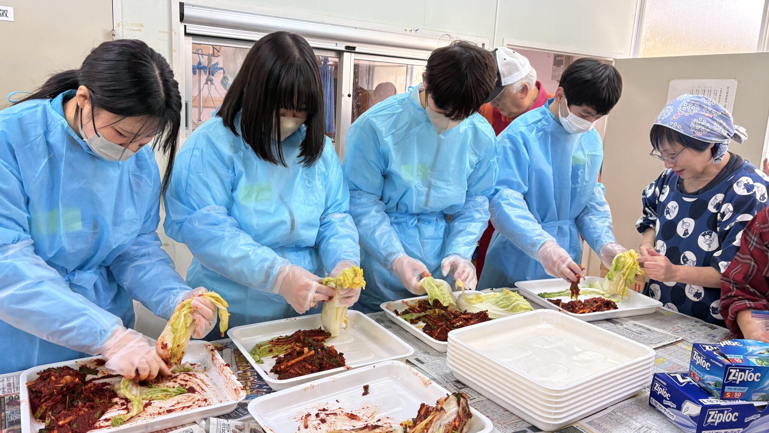 当日は、前回に引き続き「南三陸311メモリアル」を訪問し、当時庁舎で働いていて被災した方から震災当時の状況についてお話を伺いました。学生たちは、被害の甚大さとともに、その影響が長く続いていることの重さを改めて実感しました。その後、歌津復興交流センターにて、地元の高齢者やご家族など17名の皆さまと一緒に、血圧測定やキムチ作りなどを行いました。作業を通じて会話も弾み、参加者同士がお互いに元気をもらえる温かい交流会となりました。