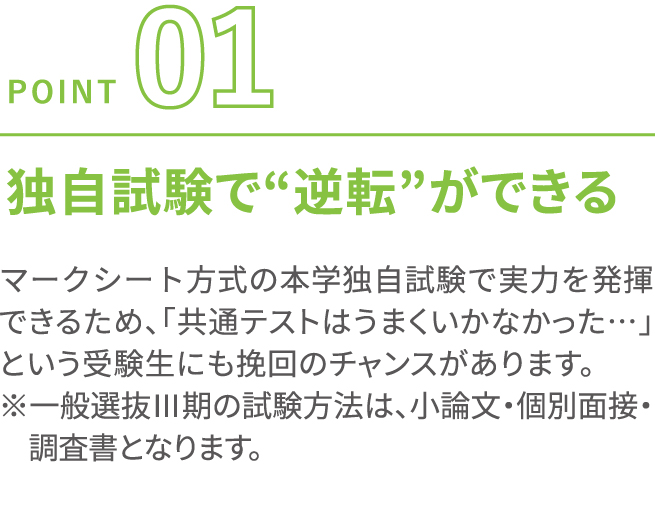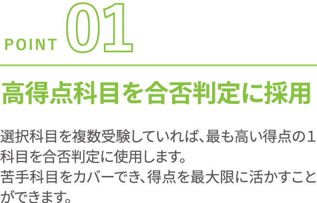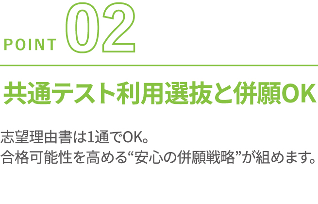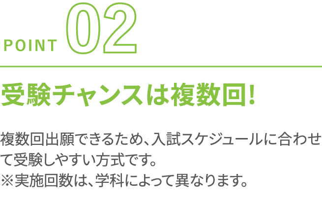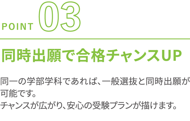 得意分野を最大限に活かし、合格をしっかりと狙える受験方式を選べます。同時出願で受験すれば、可能性はさらにUP!チャンスを広げて、自信を持って挑戦できます。